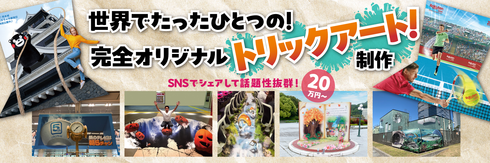 サービス紹介 プロジェクションライトイルミネーション【GOBOライト】 イベントコンテンツ トリックアート制作・レンタル 10万円前後で実施できるフォトスポット リボードで制作!環境に優しいフォトスポット UVプリント事業 フラッシュアート 謎解きゲーム企画・制作 空間装飾 イベント企画 広告・販促 BtoC事業