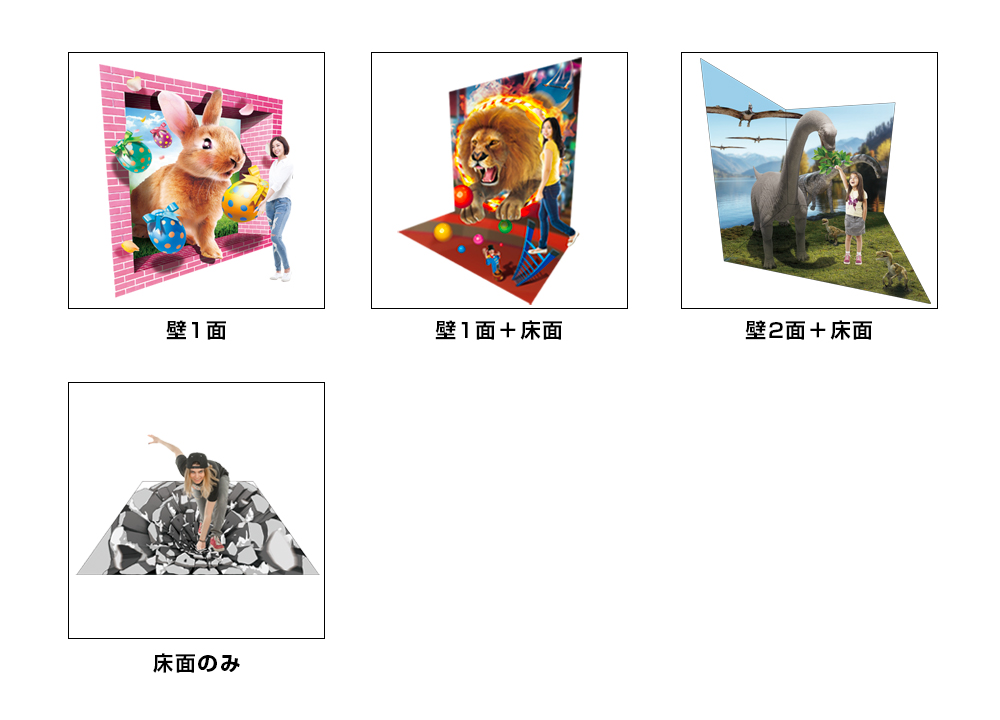 壁・床・もしくはその両方を使い、トリックアートで空間を演出します。
