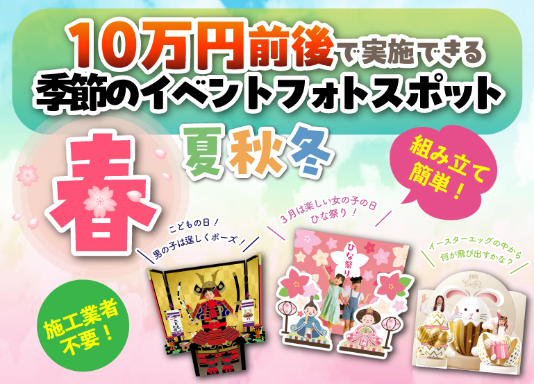 ひな祭り、母の日、父の日など、季節ごとのイベントを彩るオリジナルフォトスポットをお届けします!リサイクル可能な白エコパネルを使用しているため、環境に優しいだけでなく、軽量で取り扱いも簡単です。