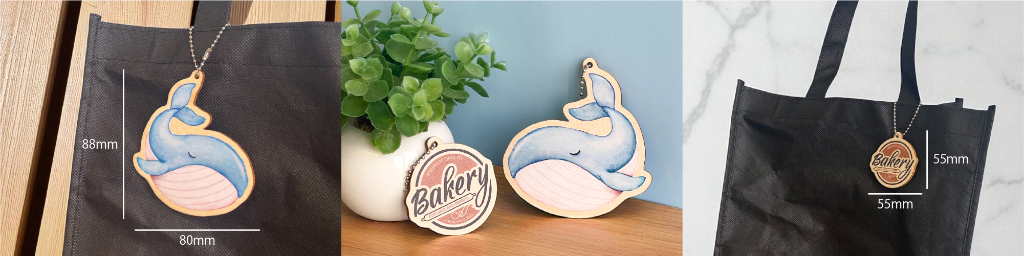 オリジナル木製キーホルダーを1個から作成できます。様々なサイズをご用意。片面、両面プリントも対応可能です。